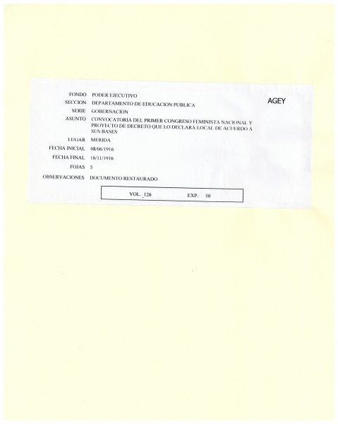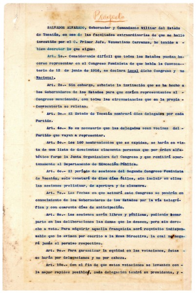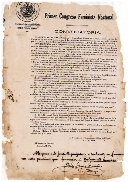 Convocatoria para el Primer Congreso Feminista Nacional y proyecto de decreto que lo declara local, emitido por el Gobernador y Comandante General de Yucatán, Salvador Alvarado. Entre los temas a resolver destacan la educación, el voto de la mujer en las elecciones municipales, el divorcio y la educación de los hijos. Mérida, 16 de noviembre de 1916
