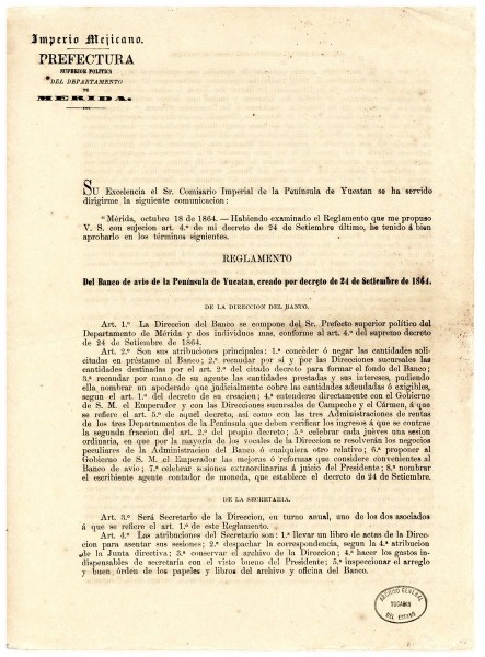Decreto del Comisario Imperial que promulga el reglamento del Banco de Avio de la península de Yucatán. Se establece con un capital de 15,000.00 pesos, y los pagarés emitidos serían por medio del fiador y dos testigos.Mérida 24 de septiembre de 1864.