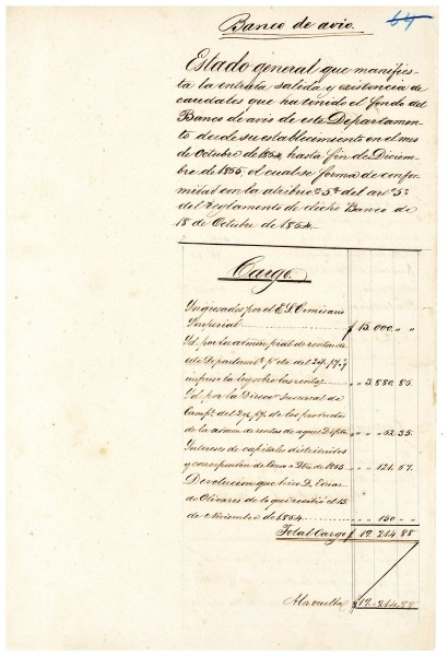 Estado general que manifiesta las entradas, salidas y existencias de caudales del fondo del Banco de Avío, entre octubre de 1864 y diciembre de 1865