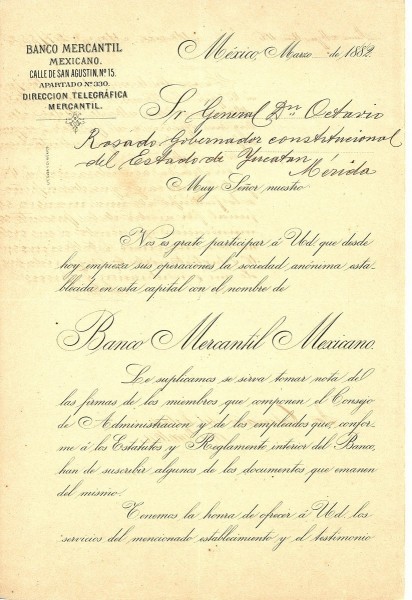 Correspondencia del Presidente del Consejo de Administración del Banco Mercantil Mexicano al gobernador de Yucatán, Gral. Octavio Rosado, sobre el inicio de operaciones, con los integrantes que componen el consejo de administración y los empleados con base a los estatutos y reglamentos. México, 27 de marzo de 1882