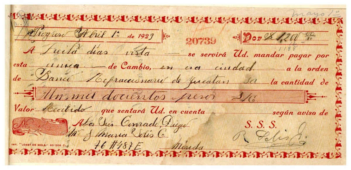 Pagaré certificado por el notario Ricardo Alpuche, por la cantidad de 1,200.00 pesos a la orden del Banco Refaccionario de Yucatán, en la demanda del juicio ejecutivo mercantil contra los señores Conrado, Diego María y María Solís. Progreso 1 de abril de 1929