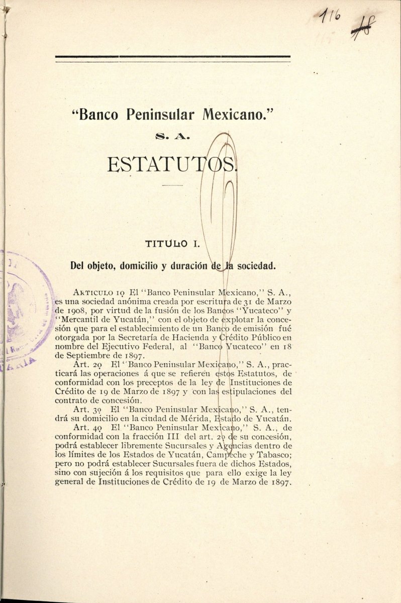 Estatuto del Banco Peninsular Mexicano. Establece la formación de la sociedad, con un fondo social de 16, 500,000.00 de pesos, para la emisión de 165,000 acciones de a 100.00 pesos cada una. La administración fue conformada por nueve miembros propietarios y nueve suplentes, la duración de la sociedad fue de treinta años. Mérida 30 de mayo de 1908