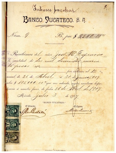 Pagaré por la cantidad de 2,240.00 pesos, otorgado por Jose María Espinosa, sobre la cantidad de 105,000.00 mil pesos que le adeuda al Banco Yucateco, S.A, por hipoteca de la finca Chinkila.