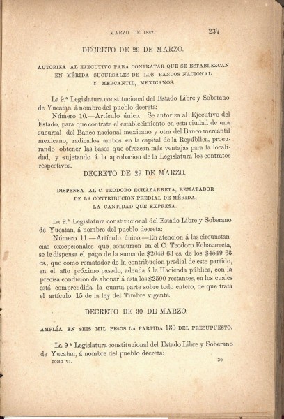 Decreto promulgado por el gobierno del estado de Yucatán, sobre la autorización para establecer en Mérida sucursales de los Bancos Nacional y Mercantil Mexicanos. Mérida 29 de marzo de 1882.