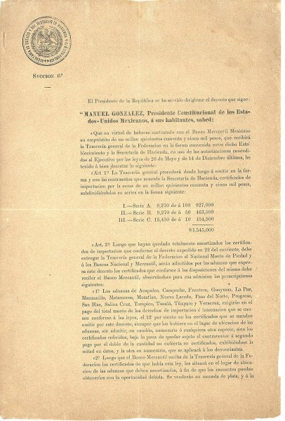 Decreto del Presidente de México, Manuel González, emitiendo tres series de certificados de importación para amortizar 1, 545,000.00 pesos,
