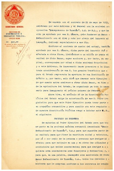 Proyecto de decreto del Poder Ejecutivo del Estado, para que forme parte de la creación de la sociedad anónima mercantil denominada Banco Refaccionario de Yucatán, S.A, para suscribir parte de su capital con el dieciocho por ciento del impuesto al henequén. Mérida 24 de enero de 1927