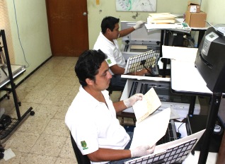 4. Centro de Restauración y Conservación Documental El Centro de Restauración y Conservación Documental es el encargado de conservar los documentos dañados por quemaduras de tinta, polilla, hongos, manipulación u otros agentes externos. Entre las actividades que corresponden al AGEY está la de organizar talleres y cursos de capacitación para la administración de los archivos públicos de las oficinas del Gobierno del Estado. |