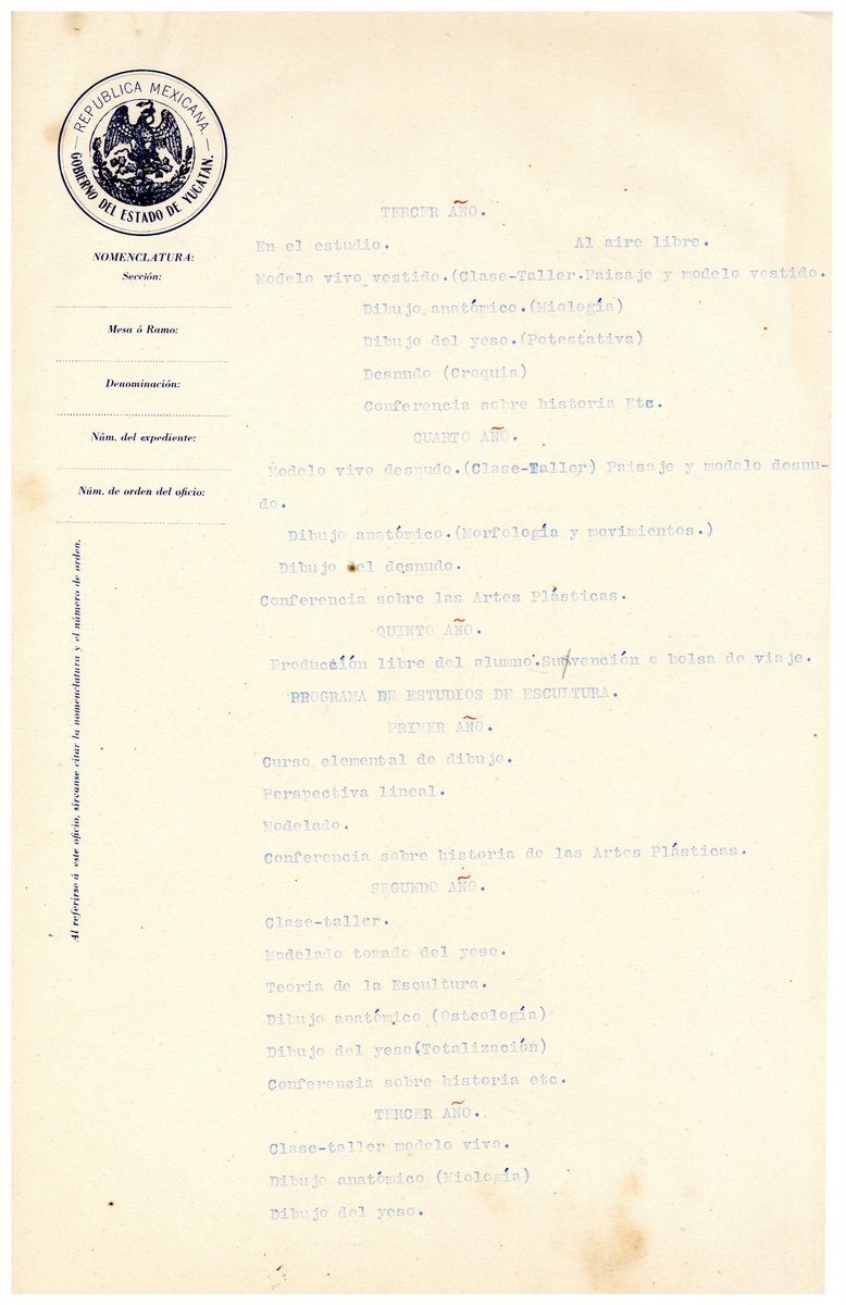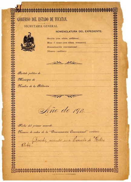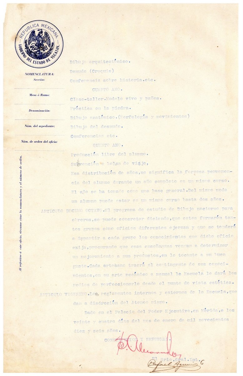 Decreto del Gobernador, Gral. Salvador Alvarado, sobre la fundación de la Escuela de Bellas, dependiente en su organización y técnica escolar de la sección de Artes Plásticas del Ateneo Peninsular. Estableció un Programa General de estudios basado en el sistema de clases-talleres para la enseñanza del dibujo, pintura, escultura y, grabado. Mérida, 24 de enero de 1916