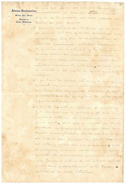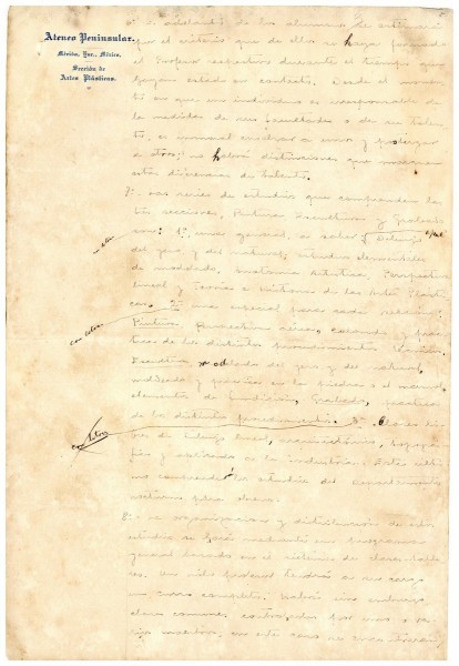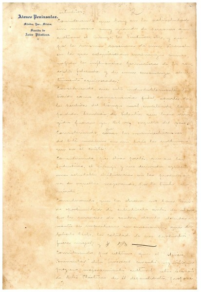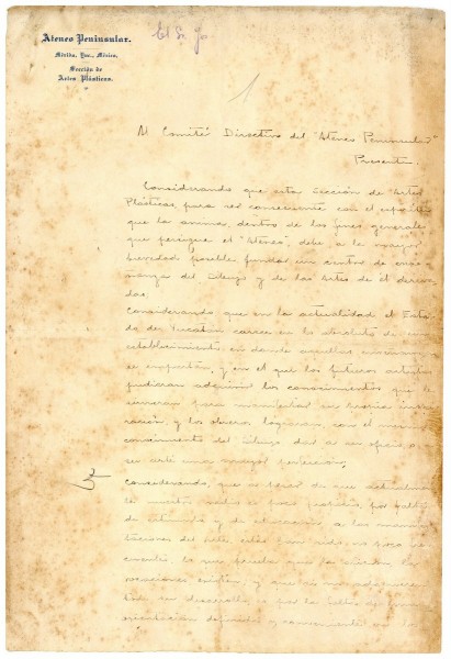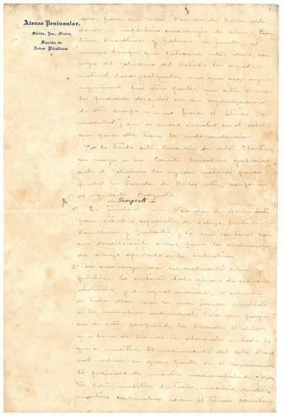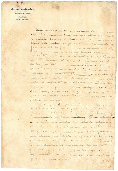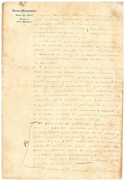 El Presidente de la Sección de Artes Plásticas, presenta un Proyecto al Comité Directivo del Ateneo Peninsular, para que gestione ante el Gobernador, Gral. Salvador Alvarado la ayuda material para la fundación de la Escuela de Bellas Artes. Mérida, 14 de enero de 1916