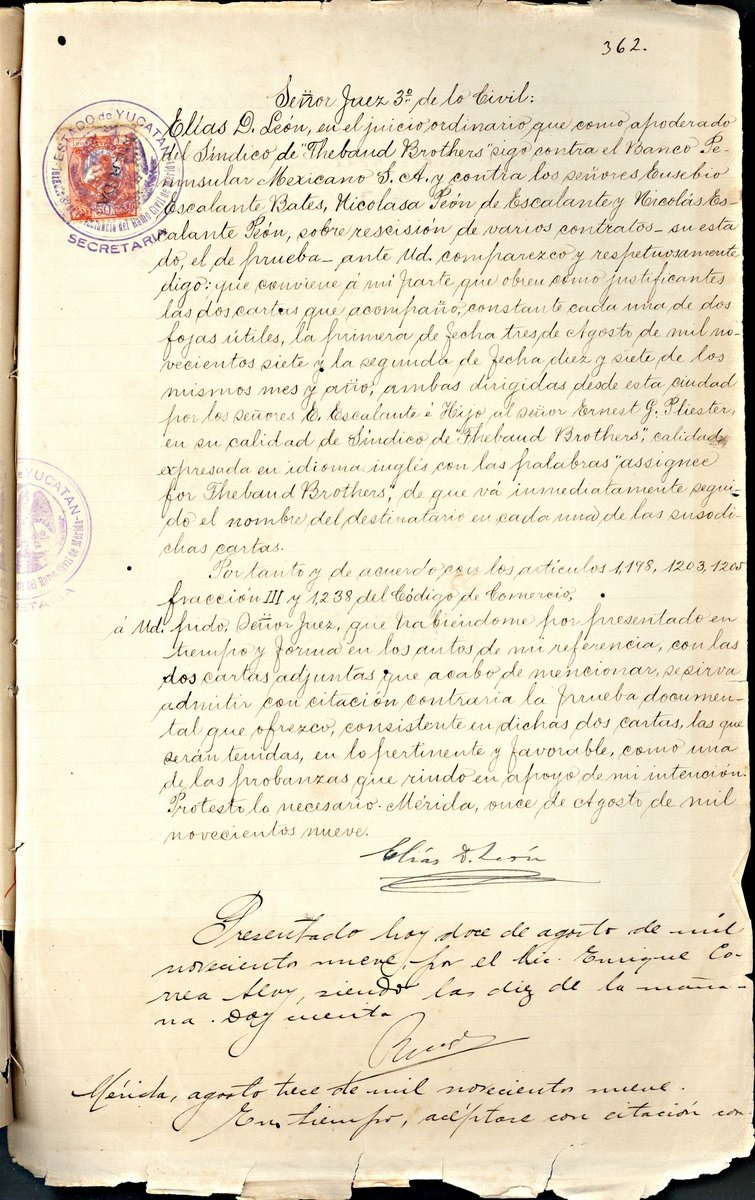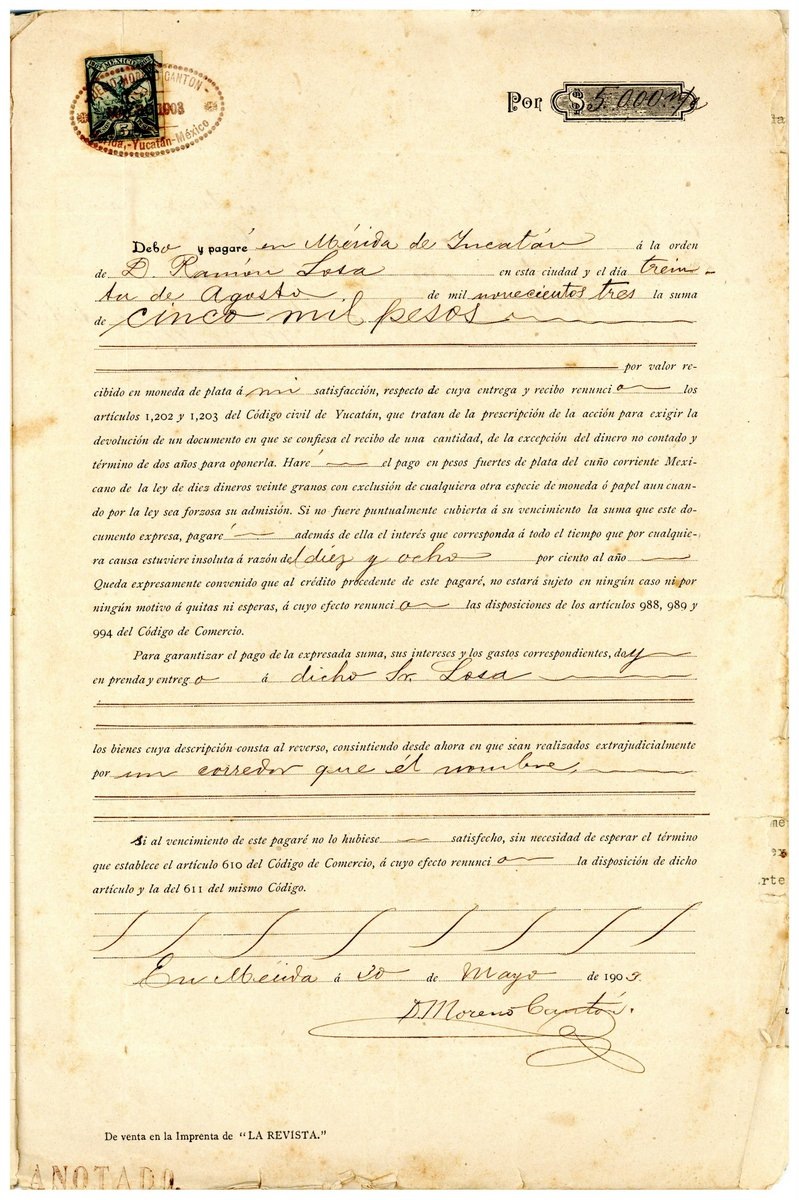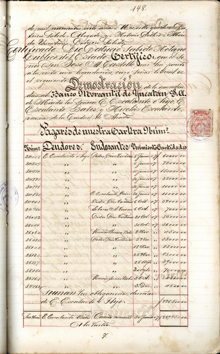Pagaré certificado por el notario Patricio Sabido, donde el abogado, Jose María Castillo, representante de los señores Escalante e Hijos, Escalante Bates y Nicolás Escalante, realiza la liquidación de la deuda al Banco Mercantil de Yucatán y al Banco Peninsular Mexicano S.A. Mérida a 5 de julio de 1907