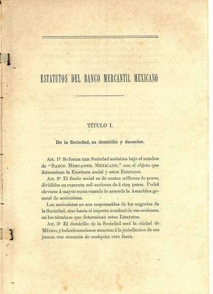 Estatuto del Banco Mercantil Mexicano. Establece la formación de la sociedad con un fondo social de 4, 000,000.00 de pesos para la emisión de billetes al portador y acciones. La administración estaba formada por un Consejo compuesto por diez miembros propietarios y cinco suplentes. México 6 de octubre de 1881
