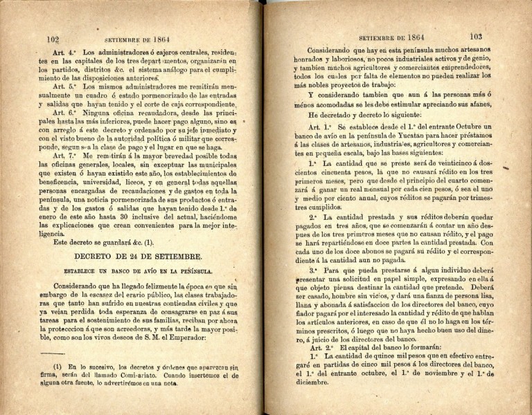 Decreto del Comisario Imperial Jose Salazar Ilárregui, donde se establece un Banco de Avío en la península de Yucatán, para la realización de préstamos a los artesanos, industriales, agricultores y comerciantes en pequeña.Mérida 24 de septiembre de 1864