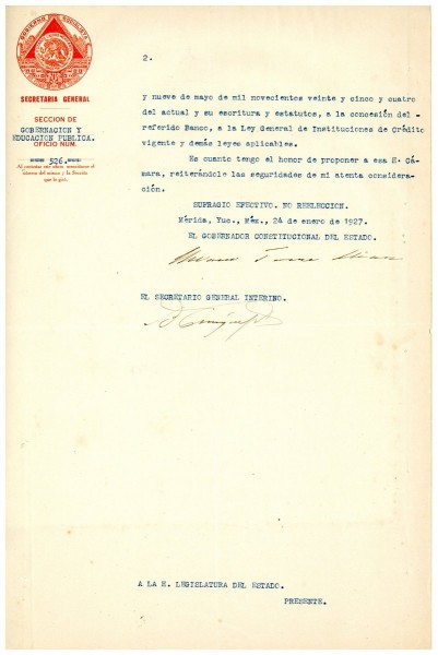 Proyecto de decreto del Poder Ejecutivo del Estado, para que forme parte de la creación de la sociedad anónima mercantil denominada Banco Refaccionario de Yucatán, S.A, para suscribir parte de su capital con el dieciocho por ciento del impuesto al henequén. Mérida 24 de enero de 1927